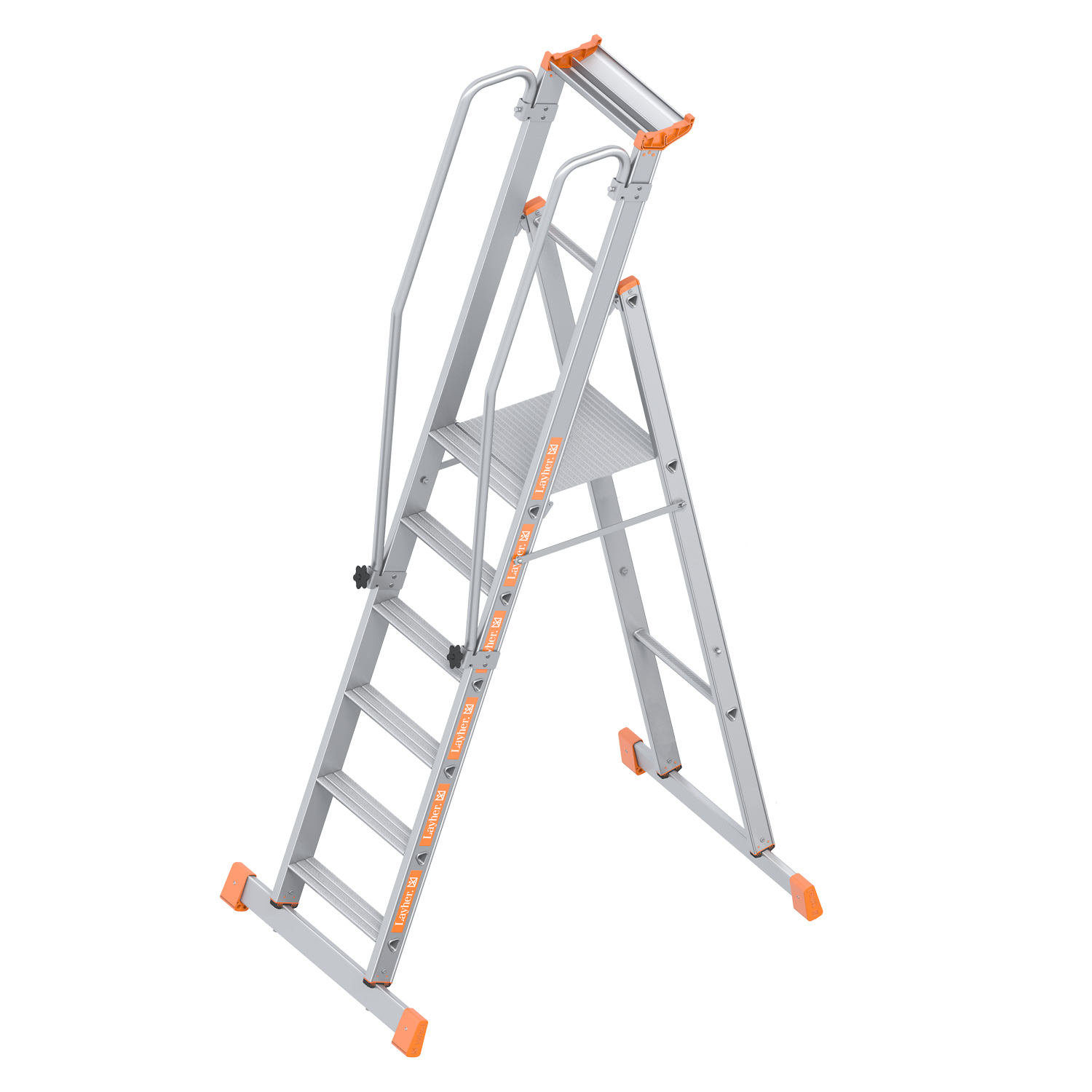 ![]() | Die große Plattform mit 480 x 420 mm aus rutschsicherem Riffelblech sorgt für sicheren Stand vor allem bei längerem Verweilen auf der Leiter. Beidseitig am Holm montierte Handläufe ermöglichen einen sicheren Halt beim Auf- und Abstieg. Eine zusätzliche Knieleiste und eine auf 1 Meter Höhe über der Plattform angebrachte Haltevorrichtung in Form einer zweigeteilten Werkzeugablageschale aus Aluminium sorgen für guten Stand und damit sicheres Arbeiten. Die beidseitige Traverse als Basisverbreiterung erhöht die Standfestigkeit der Leiter. |