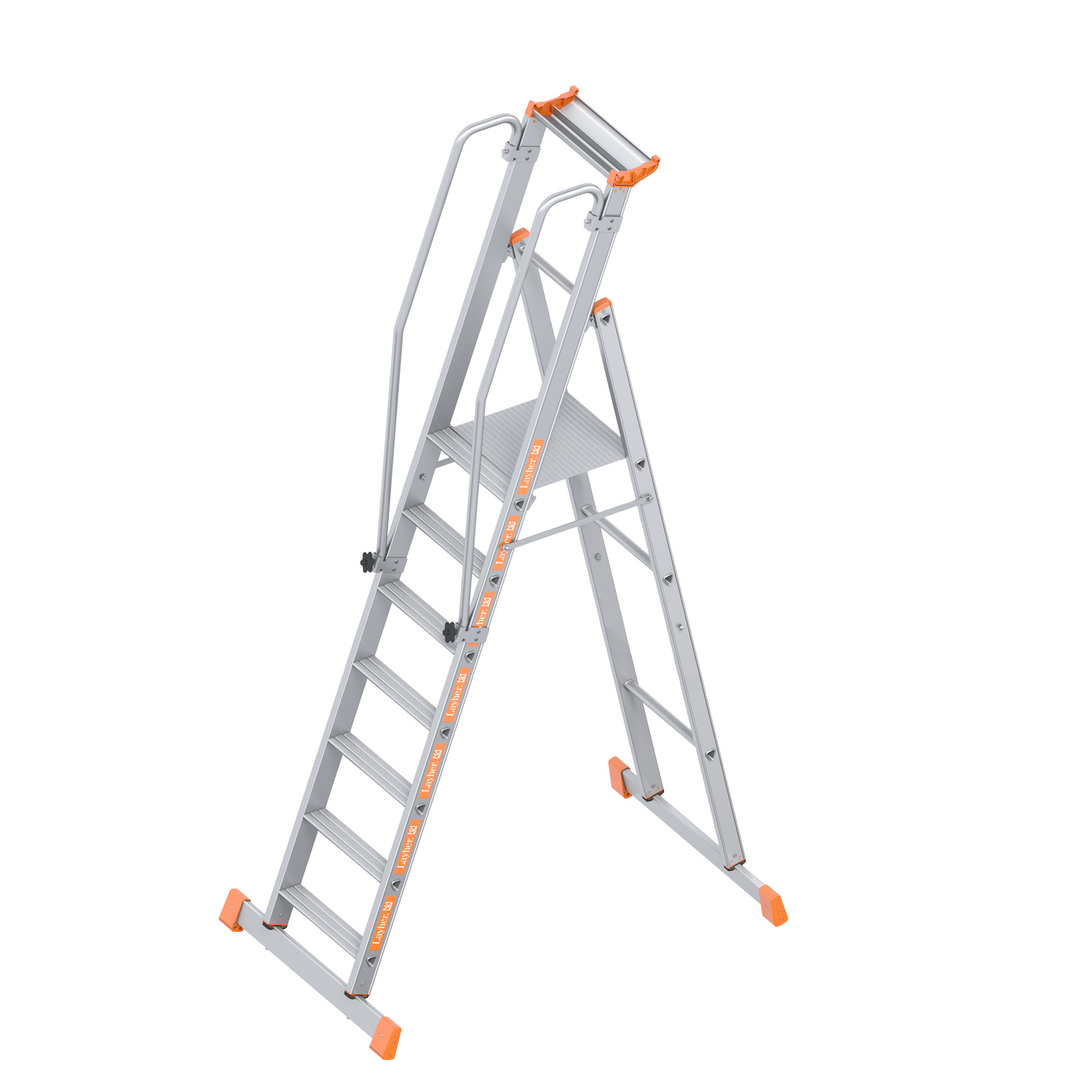 ![]() | Die große Plattform mit 480 x 420 mm aus rutschsicherem Riffelblech sorgt für sicheren Stand vor allem bei längerem Verweilen auf der Leiter. Beidseitig am Holm montierte Handläufe ermöglichen einen sicheren Halt beim Auf- und Abstieg. Eine zusätzliche Knieleiste und eine auf 1 Meter Höhe über der Plattform angebrachte Haltevorrichtung in Form einer zweigeteilten Werkzeugablageschale aus Aluminium sorgen für guten Stand und damit sicheres Arbeiten. Die beidseitige Traverse als Basisverbreiterung erhöht die Standfestigkeit der Leiter. |